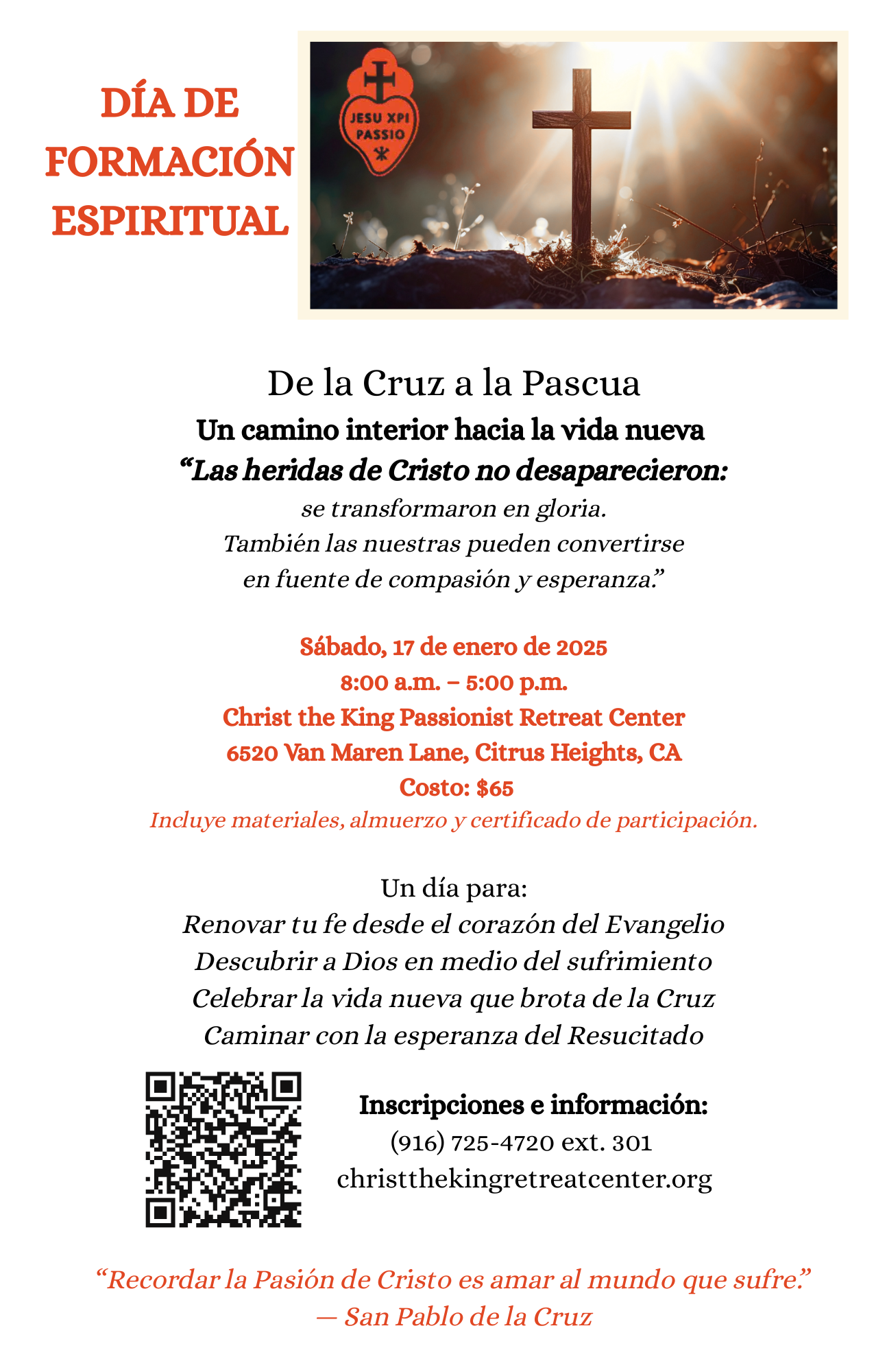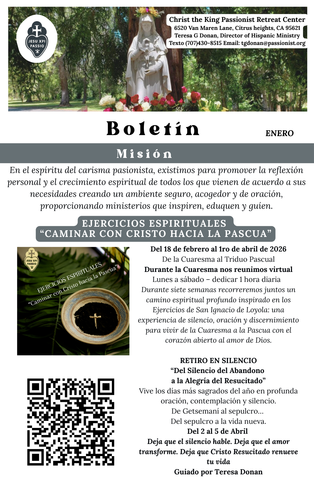 La Casa de Retiros (Ejercicios Espirituales) “Christ the King”, conocida en Inglés como “Christ the King Passionist Retreat Center,” es un ministerio de la Comunidad Pasionista. Aunque tenemos mas de 70 años de presencia en la diócesis de Sacramento, todavía hay bastante gente que no nos conoce. Bienvenidos a nuestra página web. Permítenos presentarnos: