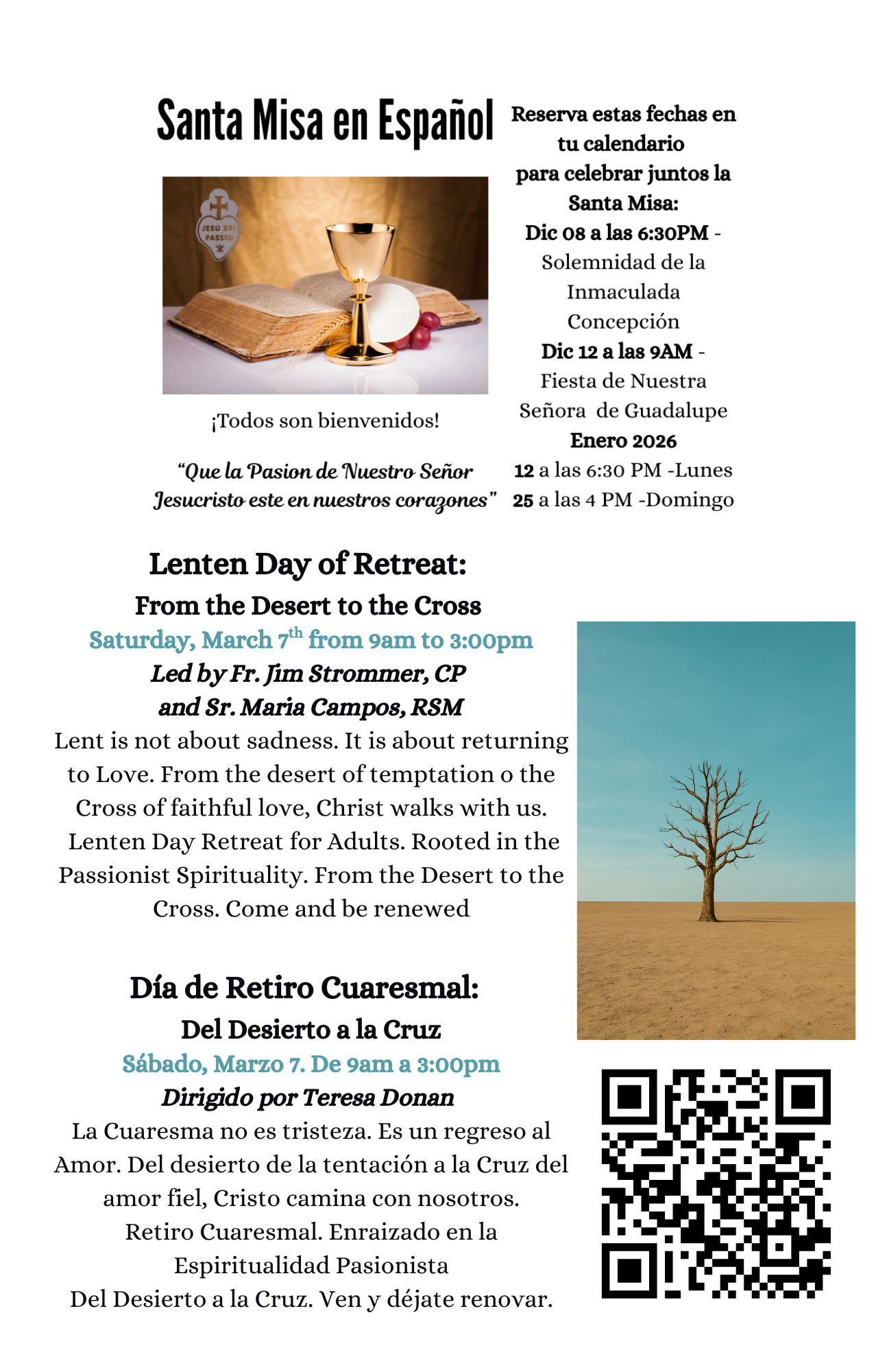 -Regularmente el Segundo Lunes del Mes tenemos “LUNES PASIONISTA” donde tenemos Adoracion, Rosario, Confesiones, Santa Misa y Convivencia de 6:30 a 8:30PM en Español. Ademas, iniciamos con una Misa en Domingo al mes a las 4pm el último domingo del mes. Excepto en diciembre. ¡Te esperamos con alegria!