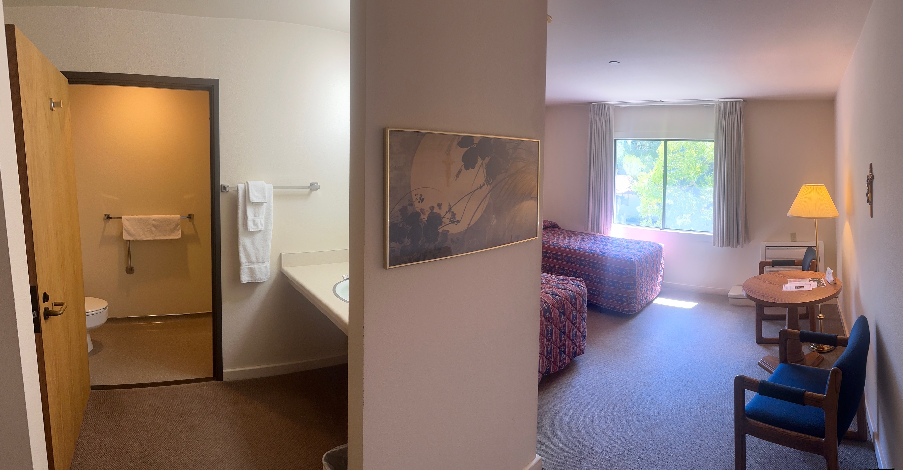 Private RoomsChrist the King Retreat Center offers 67 rooms each with its own private bathroom including two luxury suites. Each room is fully air-conditioned and heated and features a writing desk and lounge chair. All rooms afford a beautiful view of our old growth oak and redwood tree groves. Our two luxury suites include a separate sitting area and modern kitchenettes.